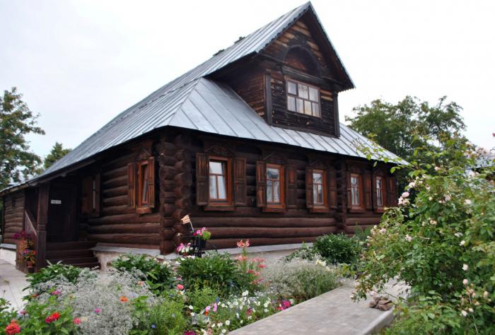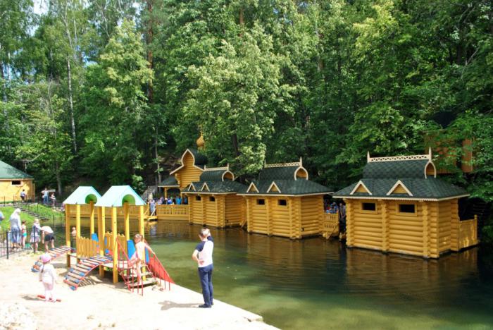 Бревенчатые, желтые домики — купель. 2 домика для женщин и 1 для мужчин.