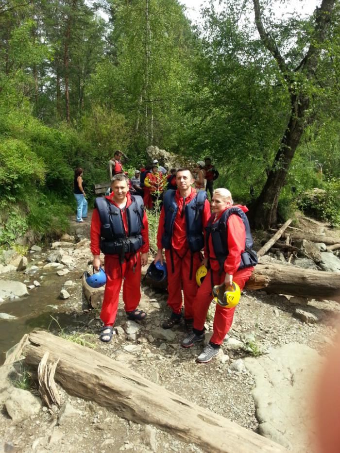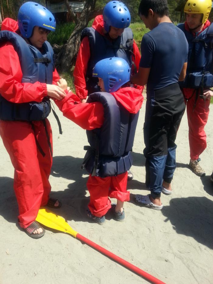 День седьмой. 18.06.2015 года мы поехали на сплав! Этого события я ждал всю поездку, читал о разных организациях этого водного путешествия, возможных опасностях и травмах. Наша гид Елена посоветовала брать только те сплавы, где фирмы, их организующие, присутствуют на «рынке» давно, и в своем составе имеют профессионалов, занимавшихся этим видом спорта. По ее наставлению мы обратились в поселок Барангол (ул.Чуйская 2), рядом с туристическим комплексом «Царская охота» есть центр рафтинга (телефоны администратора 89139967033, 89236617440). От Чемала пришлось ехать на своем авто обратно в сторону Горно-Алтайска примерно 40 км. На семью сплав около 1 часа по реке обошелся, по-моему, 1200 руб. с человека. Возможно, есть фирмы и подешевле, но я думаю в таких делах на профессионализме экономить не надо. С нами был инструктор Аршан, жизнерадостный парень. Добирались на «Уазике» с командой и рафтом на место старта вверх по реке около получаса.