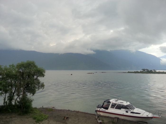 День девятый. Утром 20.06.2015 года после завтрака, сказав «До свидания» турбазе «Рояль Комфорт», мы стали держать путь в сторону Телецкого озера, а точнее населенного пункта Артыбаш. По совету наших гидов для получения представления об Алтае обязательно необходимо познакомиться с Телецким озером. Причем, не маленькой экскурсией на несколько часов, а именно пожив на нем хотя бы пару дней. Оптимальным местом для такого решения является турбаза «Кырсай» в самом начале Телецкого озера. Добраться до нее можно было двумя способами: по земле и по воде. Воздушный путь не рассматривали ввиду цены. По земле – это достаточно длительная поездка по Чуйскому тракту с преодолением перевала Кату-Ярык. Времени на этот маршрут у нас не было. По воде есть тоже два варианта: на катере, оставив машину в населенном пункте Артыбаш, или на пароме. Когда еще весной мы резервировали поездку, паром не ходил, и время запуска было еще не определено. Поэтому, мы рассмотрели вариант перемещения на катере.