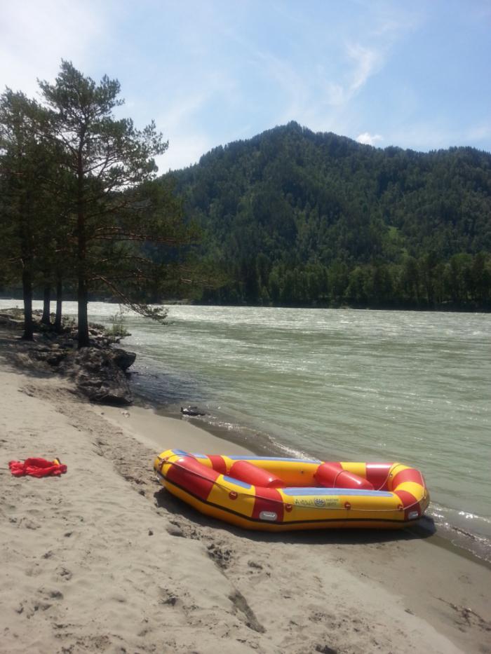 Все вещи, документы, телефоны сдали Аршану в непромокаемый мешок, и пустились в путешествие по Катуни! С учетом присутствия в нашей команде детей 10 и 8 лет, а также более старших лиц, выбрали не совсем экстремальный путь, пороги были только 1,2,3 категорий и одна бурлящая воронка. Но ощущения от водного путешествия на словах передать достаточно сложно. Восторг!!! Сидя попой на борту резинового рафта, ногами держась за трос на полу лодки, всецело ощущаешь мощь горной реки! А еще когда летишь на порог и другие бурлящие причуды реки, то поток воды, втыкающийся в лодку добавляет прелести еще больше! И это только от небольших порогов. Представляю, какой адреналин можно получить на более экстремальных спусках.
