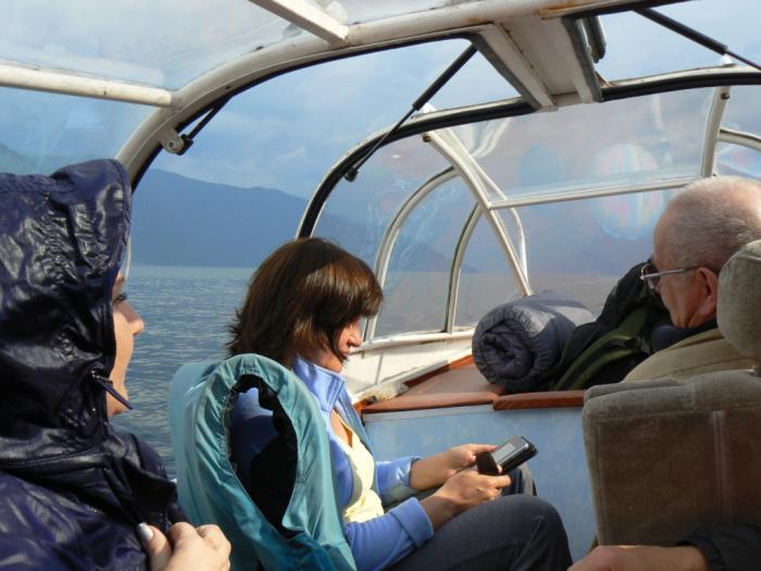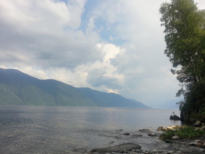 Кстати, основная часть берегов озера имеет отвесный склон, и гора просто со всей растительностью «уходит» в воду. Места для того, чтобы найти «причал» достаточно немного. Постояв минут пять под проливным дождем на берегу, мы вдруг опять продолжили движение. Дождь шел также интенсивно, над головой был эпицентр туч, и потрескивание электрических зарядов на небе ощущалось кожей спины очень явно. Слава Богу, вертикальных разрядов молнии больше не было! Как потом объяснил капитан катера, он вынужден был выдвинуться дальше, не дожидаясь окончания дождя из-за того, что после дождя на озере увеличивается высота волны. Как нам потом объяснили, за счет того, что озеро находится в ущелье между горами длиной до 50 км, ветер развивает «хорошую» скорость и волны бывают очень больших размеров. А с серьезными волнами наш катер мог бы не справиться. Вот так… Ко всем этим ощущениям красок добавляло и понимание того, что при возникновении форс-мажора быстро выбраться из катера не получится (очень узкие выходы и много людей), плюс это одно из глубоких озер России, да и температура воды не комфортна для плавания. С Божьей помощью это наше приключение завершилось благополучно! Также нужно отдать должное и мастерству капитана катера Анатолию, который достойно вел судно! В общем, постепенно гроза пошла на убыль, и мы к вечеру, лавируя между волнами и бревнами от старых деревьев (которые смыло дождем с прилегающих гор), добрались до пункта назначения.