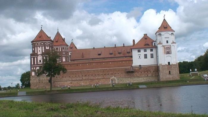 В Минск заезжать не стали, едем через объездную дорогу на Брест. Дорога – супер! (позже сравнивал дороги в государствах, по которым проехали: самые лучшие – Беларусь и Голландия. В Германии очень много дорожных работ по ремонту автобанов.) В 13.46 свернули с трассы, чтобы посмотреть местную достопримечательность – Мирской замок. Замок мы посмотрели издалека, так как ближе было не подъехать ввиду выходного дня. Было воскресенье, и желающих попасть внутрь было тоже много. Так, что припарковаться было негде (почти).