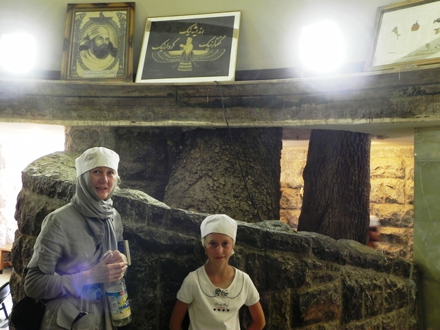 К этому времени к святилищу подтянулась ещё одна стайка туристов. Я подумал, что они паломники, но оказалось — мусульмане. Старший из них предложил нам послушать его рассказ об истории этого места и некоторым особенностям зороастрийских обрядов. Мы согласились, для чего нам снова пришлось посетить святилище, но уже с соблюдением некоторых ритуалов: снять обувь и надеть шапочку. Головные уборы всем оказались к лицу:)
