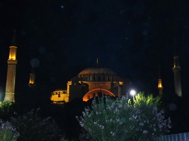 Прежде, чем отправляться в отель, традиционно делаем фото Святой Софии и Голубой мечети. Между минаретами мечети – световая растяжка со словами: «Бог любит тех, кто покается».