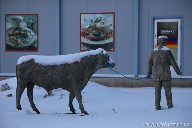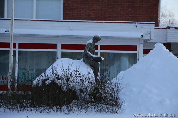 На утро у нас пятьсот километров к Миккели. Дорога прошла легко и даже интересно. Проезжая через деревеньку Rantsila удивились необычному памятнику стоящему возле молочного магазина в небольшом удалении от дороги.
