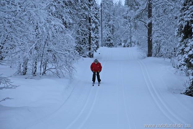Первые дни конечно после двух-трех часовых прогулок крутило всё тело, но потом втянулись и ходили с утра по три часа, и к вечеру столько же. Конечно, когда мимо проносится кто то из профи, это завораживает. Никогда не думал, что в движении лыжника столько грации. Финны детей к лыжне приучают буквально с пеленок, таская за собой возки с грудными детьми)))