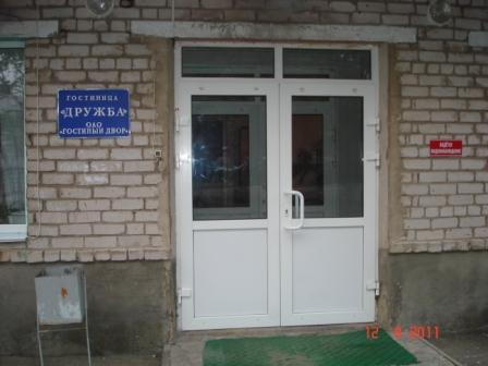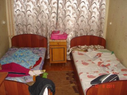 Гостиница оказалась двухэтажной (вроде бывшего детсада) – название «Дружба». Не знаю как другие номера, но трехместный оказался занят (был один на всю гостиницу). Пришлось снимать двухместный: предложили с телевизором за 750 с человека или без телевизора за 350 с человека. Мы выбрали последний вариант (телевизор кроме пары каналов ничего не показывал, а комнаты одинаковые). Комнатушка узкая, у окна – две кровати (в номере без телевизора они били немного пошире, что для нас важнее – ведь пришлось уместиться в номере втроем). Есть раковина, остальные удобства (душ, туалет) на этаже.