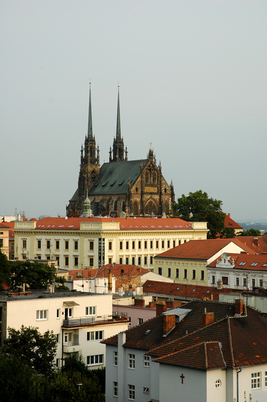Брно. Прошли весь исторический центр. Очень красивые старинные домики везде. Все улочки мощёные камнем. И в центре нет ни одного строения (кроме соборов) выше 3-4 этажей. Самый впечатляющий собор Святых Петра и Павла – высокие тонкие шпили, сам он сделан из какого-то тёмного камня.