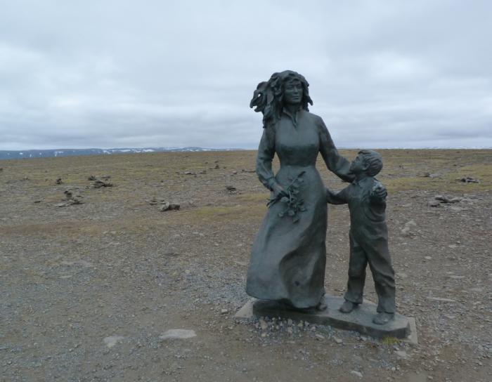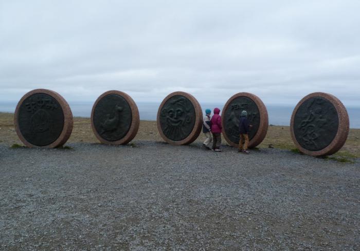 Дети, разумеется, по очереди запечатлелись на фоне достигнутой северной широты — отчитаться в классе. Кроме того, они с интересом обследовали поставленные на продуваемой всеми ветрами возвышенности памятники. А вот Аня, увидев неодетого ребенка в такую холодину, возмутилась: куда смотрит хваленая норвежская ювеналка?! :)
