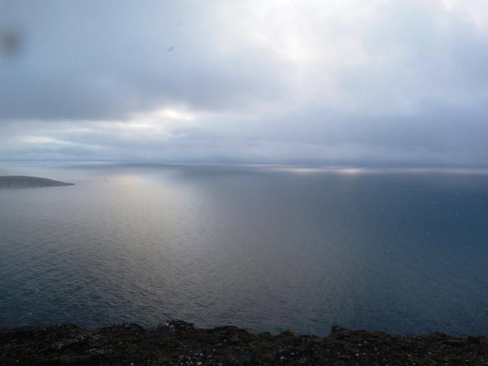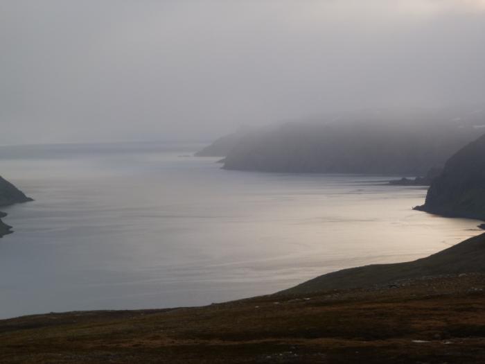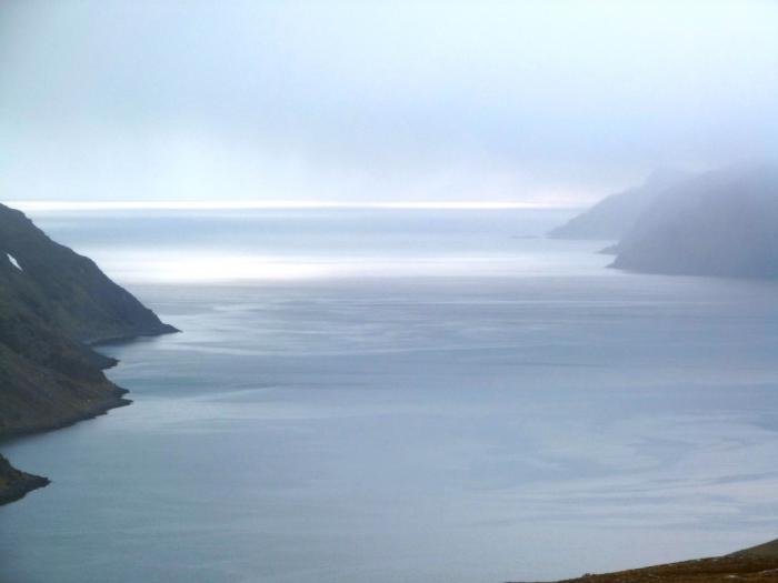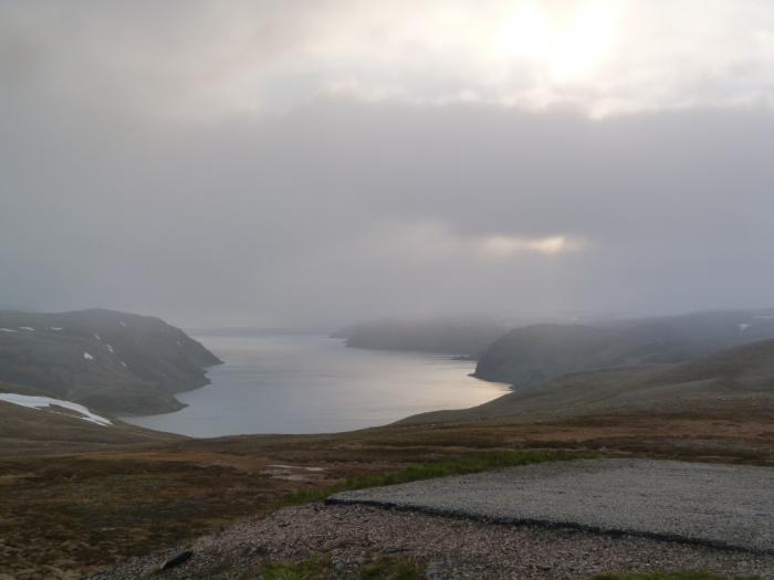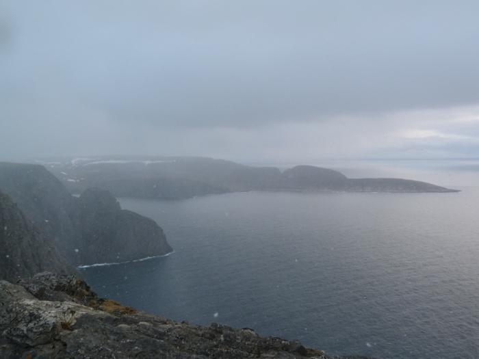 Погода меняется ежеминутно. Прямо на глазах все затягивается мрачными тучами, скрывается в пелене. Холодно — аж жуть. Справедливости ради должен сказать, что такая погода нетипична даже для Нордкапа. Обычно здесь в июне +10-12, бывает и теплее. Но в этот день, как нам сообщили друзья в сети, в Питере было +4. Что же ожидать на крайнем севере? Мерзнем, но пытаемся поймать удачный кадр.
