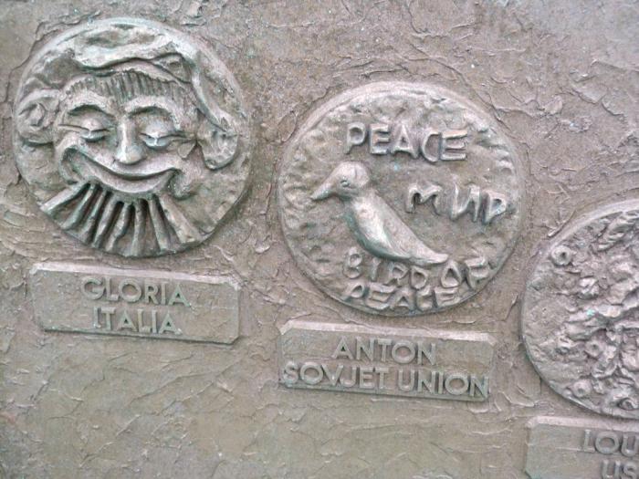 Ну, пионер не пионер, но тут и правда повеяло чем-то таким из моей юности, борьбы за мир во всем мире и т.п. Еще в советские времена сюда привезли специально выведенных отобранных детишек из разных стран, и они что-то такое символическое, на тему «мир, дружба, жевачка» нарисовали. Ну и теперь их рисунки увековечены в виде огромной скульптурной композиции: