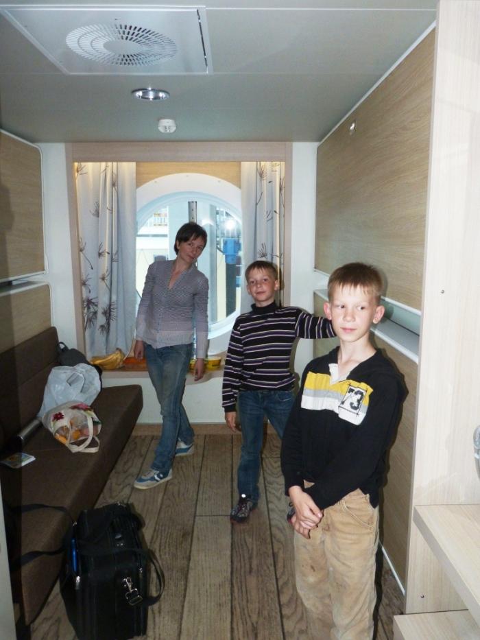Вечерняя прохлада вскоре заставила нас отправиться «по квартирам». На Viking Grace есть шестиместные (двухкомнатные) семейные каюты — так было бы дешевле всего. Но с двумя машинами приходится брать две отдельные: на одну каюту положена только одна машина, а на машину без каюты билеты не продаются. Взяли стандартную двухместную каюту без окна и четырехместную с иллюминатором (за это приходится чуть-чуть доплачивать, но я решил расщедриться на случай приступа клаустрофобии у кого-нибудь из пассажиров).