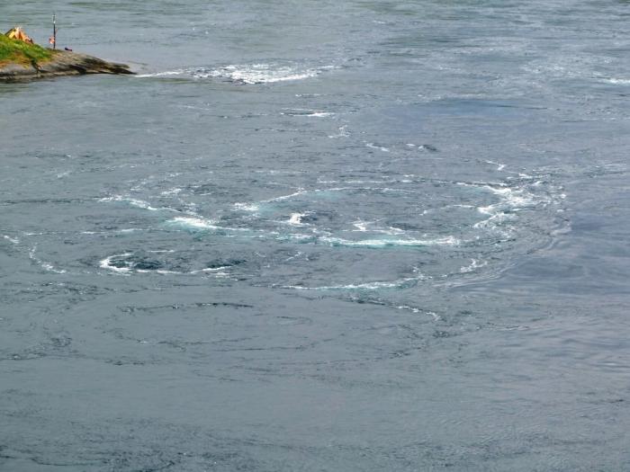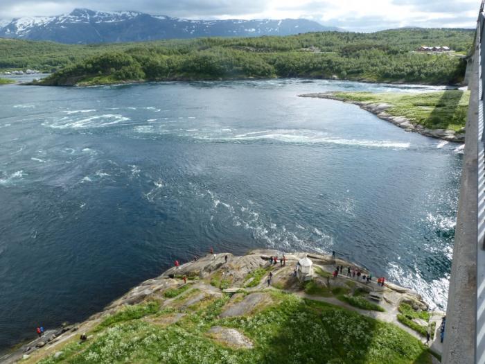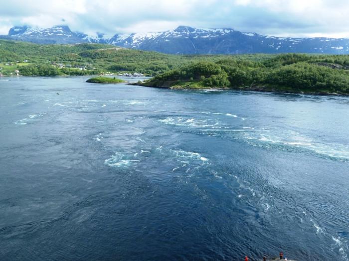 Великим писателям простительно преувеличивать. Среди же более приземленных автопутешественников, побывавших в Сальстраумене, мнения не совпадают. Одни считают, что достопримечательность это дутая, обычная туристическая замануха, и смотреть тут не на что. Другие же — в восторге от увиденного. Кроме обычного «о вкусах не спорят», сказывается и время посещения. Дело в том, что водовороты Saltstraumen создаются приливами и отливами, которые порождают сильнейшее в мире течение такого рода. Огромный залив соединен здесь с морем узеньким горлышком 3 км длиной и всего 150 метров в поперечнике. Каждые 6 часов масса воды с большой скоростью прокачивается через это горлышко, уходя в море или наоборот, и в результате рождаются многочисленные водовороты. Так что если уж пытаться увидеть что-то интересное, то именно в часы пик. На каждый день существует расписание. В тот вечер «шоу» показывали в 17:08 и 23:27. Так что нам стоило поторапливаться.