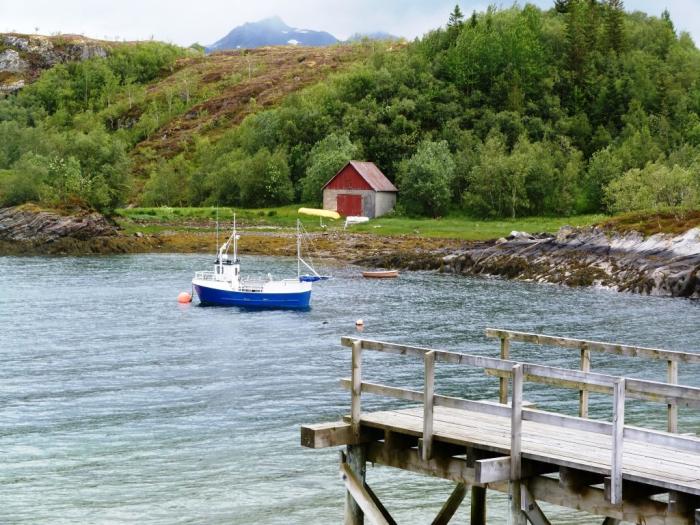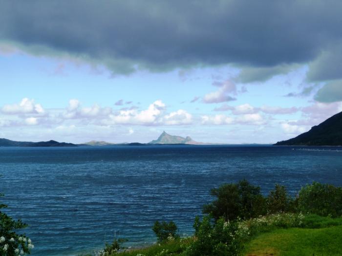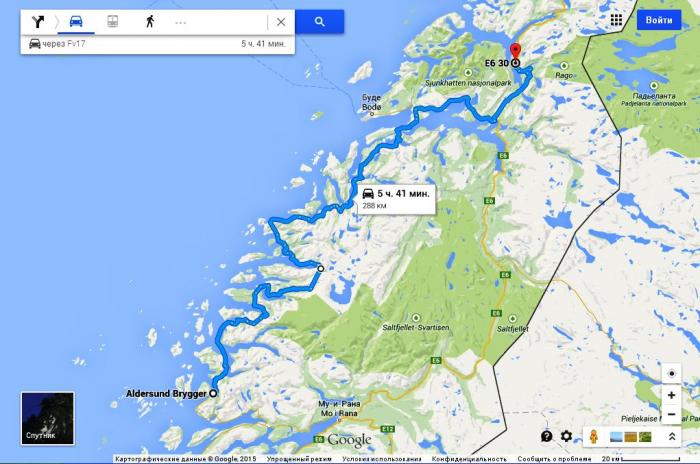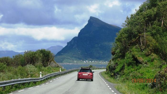 FV17 или 17-я дорога — одна из самых живописных частей пути на север Норвегии. Правда, удовольствие это дорогостоящее и время-затратное. Дорога тянется пунктиром вдоль изрезанного фьордами побережья страны, и автопутешественникам приходится двигаться «от парома к парому». Поэтому в нашем беглом знакомстве с красотами Норвегии мы, проехав по Атлантической дороге и осмотрев Тронхейм, предпочли пропустить южную половину FV17 и избрали более простой путь по магистрали Е6. Даже в таком варианте было бы лучше свернуть на 17-ю дорогу в Mosjøen. Вместо этого мы бестолково кружились вокруг пещеры Грёнлигротта, так ее и не посетили, но уже поздно вечером выскочили, наконец, на желанный прибрежный путь, где и заночевали.