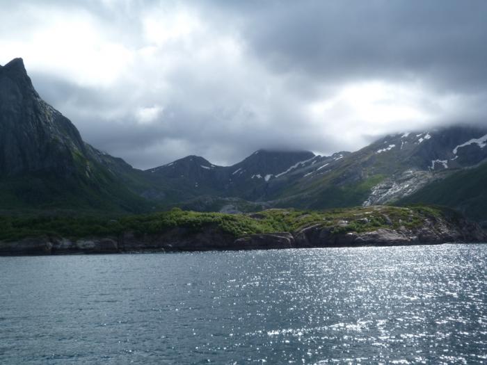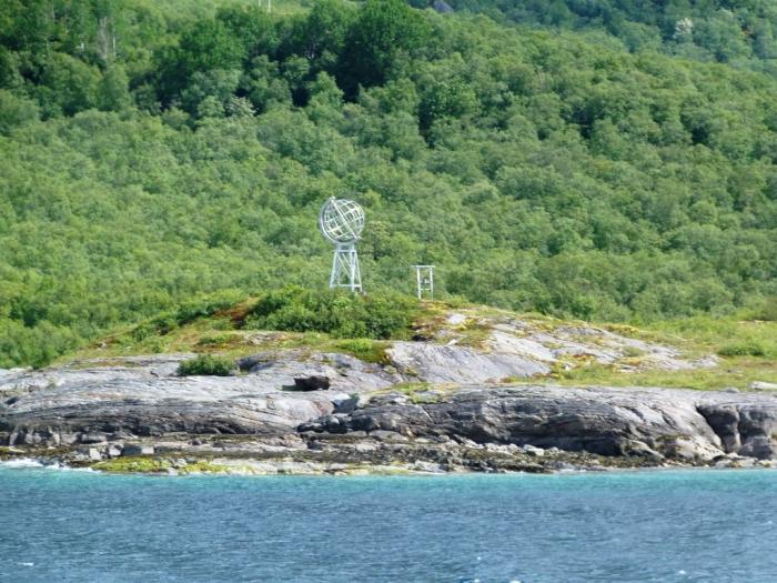 Уразумев это, северная Норвегия угомонилась, и позволила нам пересечь полярный круг при вполне пристойных погодных условиях. Переплывать эту воображаемую линию здесь, на пароме, плывущем вдоль узких фьордов, было как-то приятно и уместно. Она обозначена ясно, но без навязчивости: серебристым глобусом на берегу: