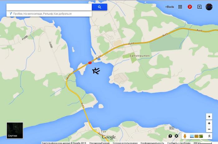 По совету умных людей, водовороты мы собрались посмотреть с моста Saltstraumbrua, как обозначено на схеме выше (клякса — где больше всего водоворотов образуется).