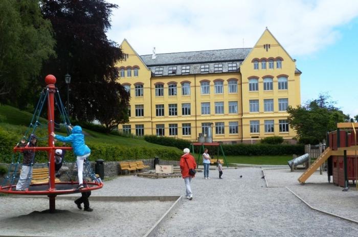 Чуть дальше мы обнаружили большую детскую площадку, на которой наши дети вновь принялись резвиться. Фотографии плохо передают «осеннюю погоду», которая сменила в тот день теплое солнышко предыдущей недели. Дожди еще не начались, но ветер был уже очень сильный. Всем нам (и взрослым, и детям) в свитерах и куртках было довольно холодно. А местным — хоть бы хны. На фотографии можете разглядеть норвежку с малолетним сыном — оба в футболочках без рукавов!