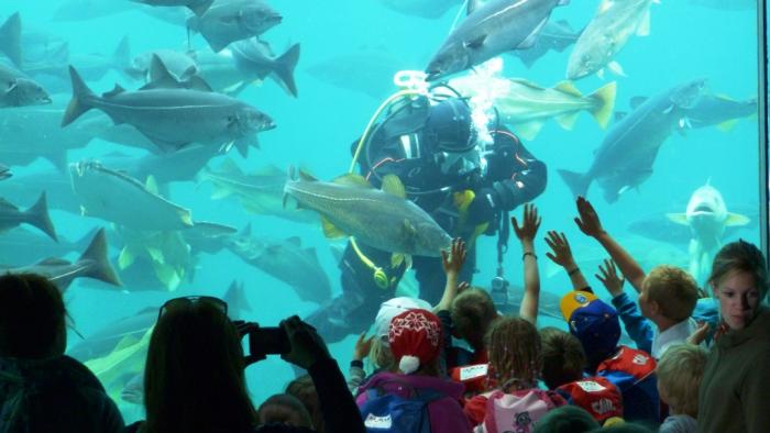 Дважды в день к обитателям этого огромного аквариума спускается водолаз, чтобы их покормить. Он почти мгновенно скрывается в большом клубке из оголодавших рыб, так что порой разглядеть там самого водолаза почти невозможно. Тем временем, ведущий программы дает пояснения на норвежском и английском, рассказывая о разных видах рыб, которые здесь водятся.