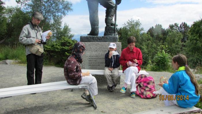 Мы же лихо взлетев по крутым дорожкам к обзорной площадке Aksla на высоту 130 метров, решили отсюда пойти осматривать город пешком. Только вот подкрепиться для начала, прямо у памятника кому-то там.
