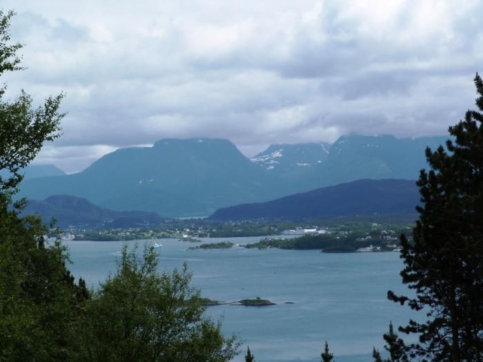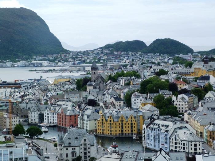 Вернувшись к машинам, мы быстро доехали до обязательной к посещению смотровой площадки Олесунна. В этом городке вообще трудно куда-то доехать не быстро. Наша хозяйка Лида работает в т.ч. гидом. Как-то группа из России из туристического круиза заказала автобусную экскурсию по городу, причем требовала, чтобы их возили по достопримечательностям не менее двух часов. Не «выгуливали», а обязательно возили! Лида терпеливо объясняла, что два часа по городу можно кататься, только если объезжать его вокруг раз пять-шесть, что погулять по улицам будет куда интереснее и приятнее. Но все ее доводы разбивались о суровую подозрительность руководителя группы, который был убежден, что гид просто не хочет полностью отрабатывать заплаченные деньги. =\