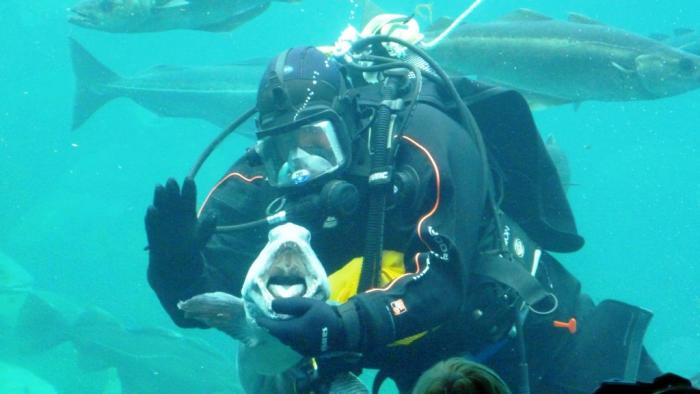 Только опустошив мешок с кормом, водолаз избавляется от большей части назойливых обитателей Атлантического океана и может немного повыпендриваться перед фотокамерами.