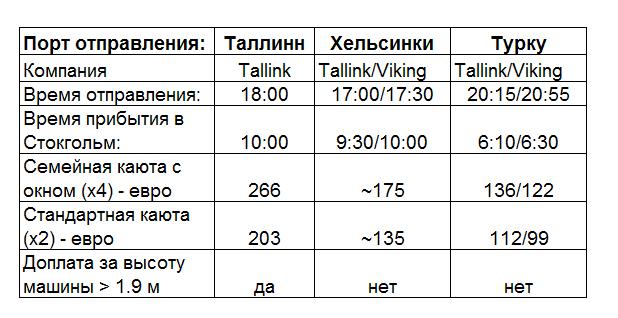 Остаются паромы из Таллинна, Хельсинки или Турку. Эти порты обслуживают две транспортные компании: Tallink Silja и VikingLine. Дневные рейсы я не рассматривал, хотя они дешевле. Но тогда нужно искать и оплачивать ночлег в стране отправления и в Стокгольме, да и световой день я предпочитаю тратить на достопримечательности. Сравнение же ночных рейсов на ту дату (с учетом существенной скидки за раннее бронирование) выглядело вот так: