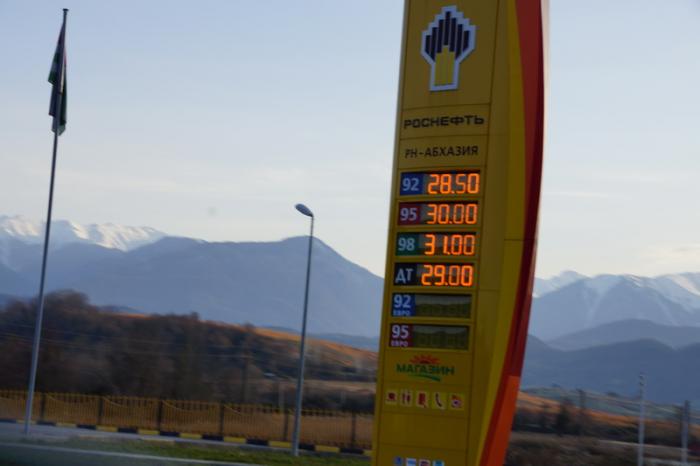 Проехав контроль, оказываешься на рынке, от куда зимой везут мешками мандарины и прочие фрукты в Россию. Вдруг мы вспомнили, что забыли заправиться в России, и не знали что нас ждет впереди, какой асфальт и какой бензин. Проехал одну безымянную заправку к нашему безумного удивлению мы увидели знакомую нам вывески Роснефть! И цены на заправке нас приятно удивили, дешевле чем в Краснодаре.
