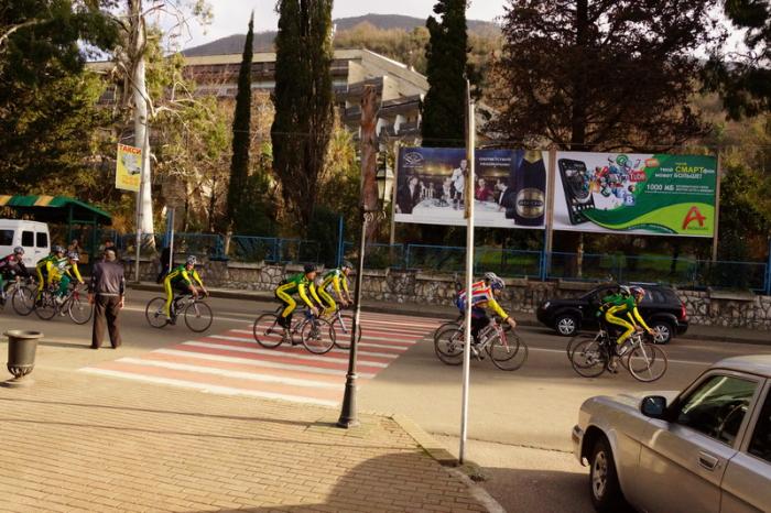 В Гаграх купили местную сим-карту. Сотовая связь дорогая, а еще дороже стоит интернет, который 3G и по мегабайтам. По дороге часто встречали тренировки российских велосипедистов.