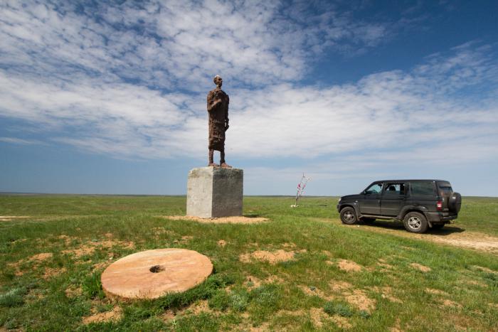 Привычный по северу метод поездок: увидели что-то интересное — свернули работает и здесь. Так в степи, на небольшом холме, стоит удивительной красоты памятник без подписи, но удивительно искусно созданный.