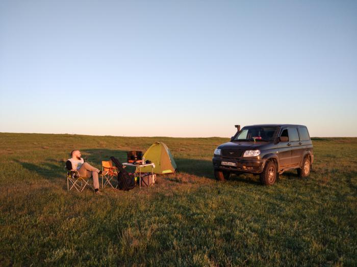 Разбили лагерь, поставили чайник, наблюдаем, как через степь едет Тойота Хилукс самой распоследней генерации.