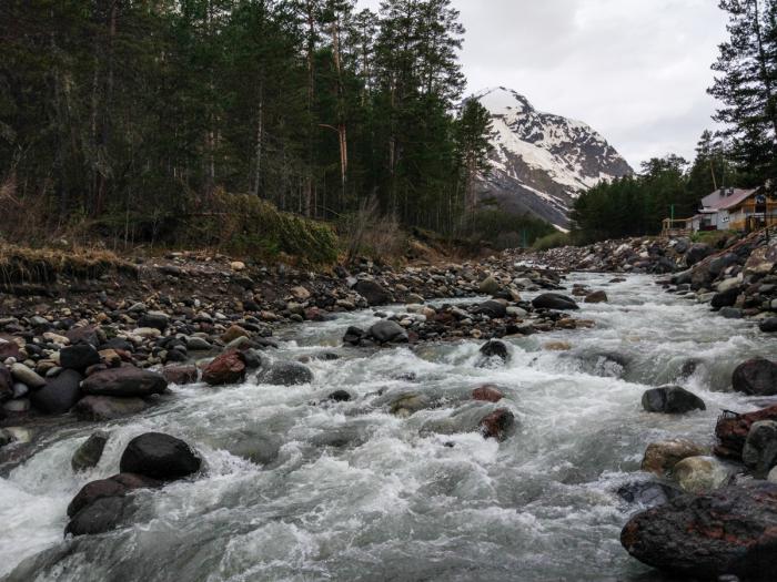 С набором высоты менялась и природная картина: луговые цветы и кустарники, ближе к полутора тысячам метров, превратились в горное разнотравье и лиственные деревья. Некоторое время мы ехали по типичной средней полосе России, а к Терсколу, оказались среди сугробов и по-Карельски высоченных сосен. В очередной раз поднявшись из равнинной тридцатиградусной жары в умеренную горную прохладу.