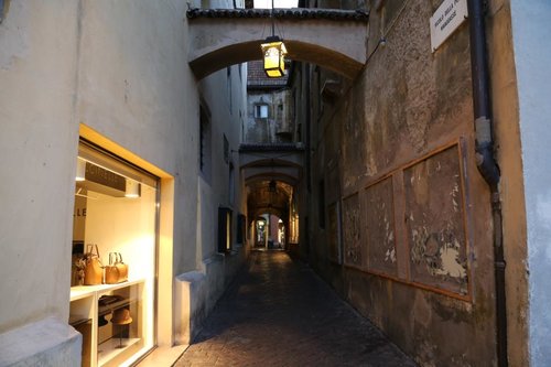 Оживленная торговля прерывается к семи вечера. Впрочем, к семи вечера и вся жизнь в Больцано начинает стремительно сворачиваться. Гуляя по городу после восьми, мы бродили уже по пустому городу. С учетом того, что в историческом центре Больцано много узких средневековых улочек в стиле подземного коридора, город становится угрюмым и мрачным. Наверное, поэтому его улицы спешно покидают одинокие прохожие. И на город опускается не только ночь, но и средневековье.