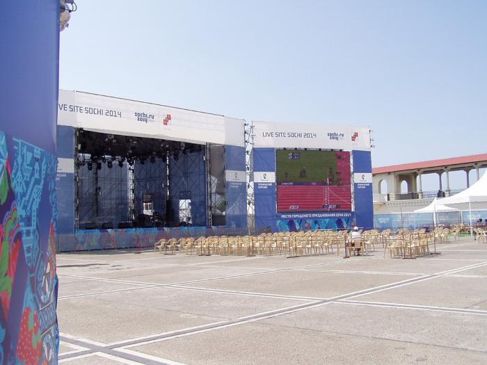 В Сочи все говорит об Олимпиадах. Этот экран был установлен на время Лондонской олимпиады, любой желающий мог бесплатно зайти, посмотреть соревнования. Только при жаре под 30 градусов желающих было немного.