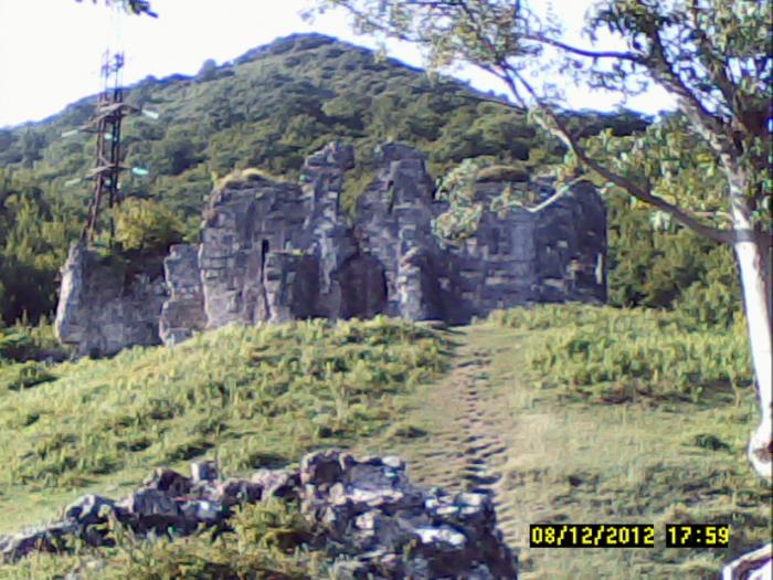Затем мы отправились к озеру Рица. По дороге нашли развалины Бзыбского храма-крепости эпохи Абхазского царства Х века. Надо было подняться на гору. Пашенька поленился, а я в босоножках на платформе все же поднялась, там правда были ступеньки.