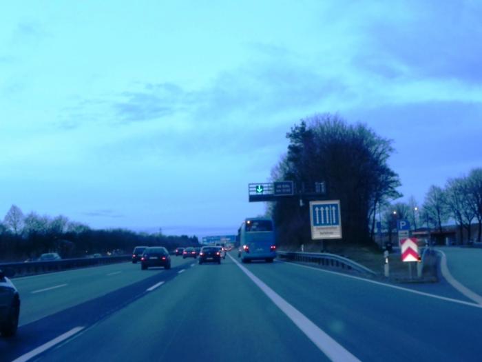 В Германии, ближе к Мюнхену, миновать который, к сожалению, крайне затруднительно, трафик ощутимо уплотнился. В связи с этим я смог обратить внимание на местное ноу-хау: для увеличения пропускной способности автомагистрали в качестве дополнительной полосы задействуется обочина, о чём сигнализирует специальный светофор.
