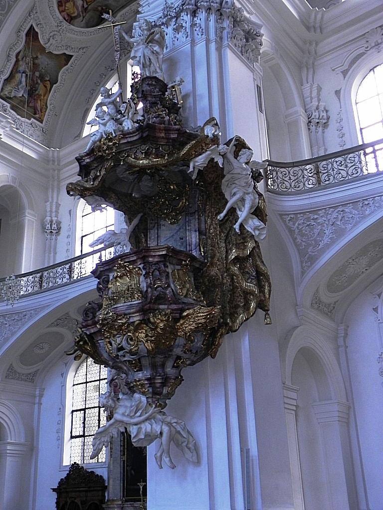 Кафедра проповедника, несмотря на, казалось бы, неуместную здесь золотую отделку, смотрится достаточно скромно, изящно и негромоздко, словно не хочет быть в центре внимания.