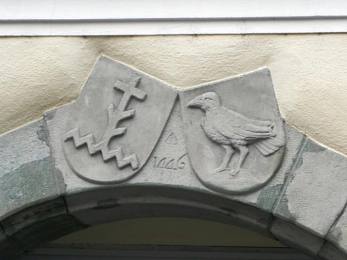 Видимо, здание неоднократно перестраивалось, поэтому и выглядит ничуть не старше своего окружения. И даже циферки над входом указывают на гораздо более позднюю дату. Но это, скорее всего, год, когда в дом заселились новые влиятельные хозяева.