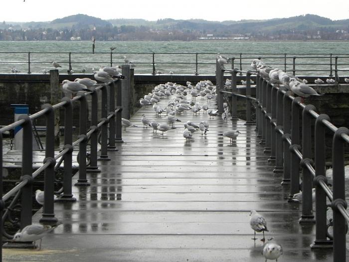 Все чайки, из-за опасения быть погребёнными под волнами или склеить ласты под воздействием морской болезни, вынуждены коротать время на причалах.