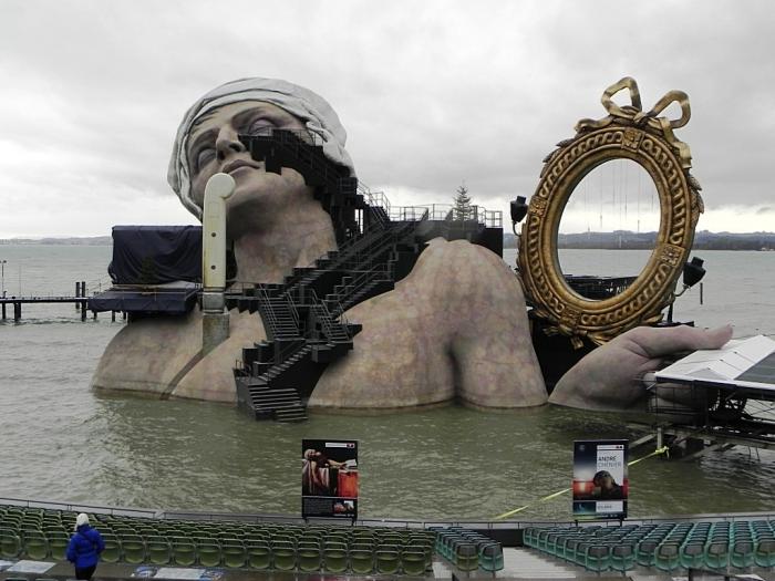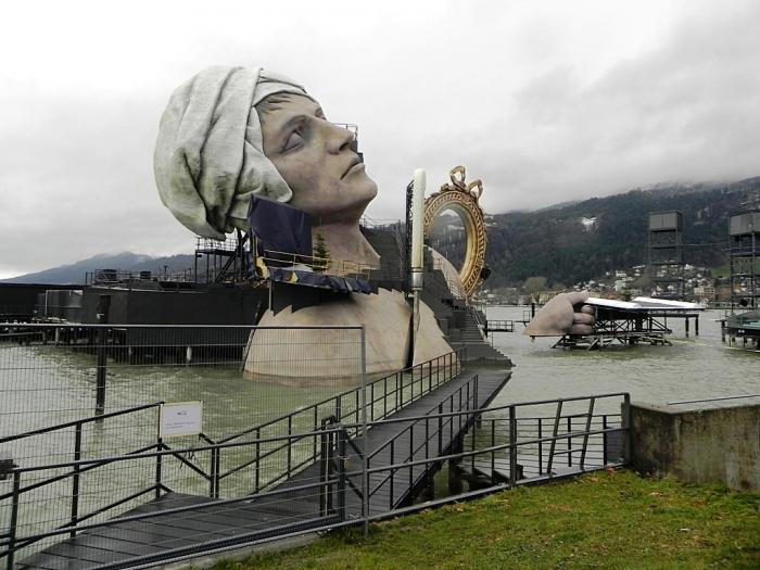Ежегодный Брегенцский фестиваль — один из важнейших в Европе. С учётом того, что трибуны открытой сцены вмещают 7000 зрителей, за месяц фестиваль посещает до двухсот тысяч зрителей, если, конечно, не вмешается непогода. Тогда спектакли проходят в зале. Сценические конструкции меняют раз в год, но на зиму не демонтируют. Поэтому мы смогли запечатлеть Озёрную сцену в том виде, в котором она использовалась для постановок спектакля