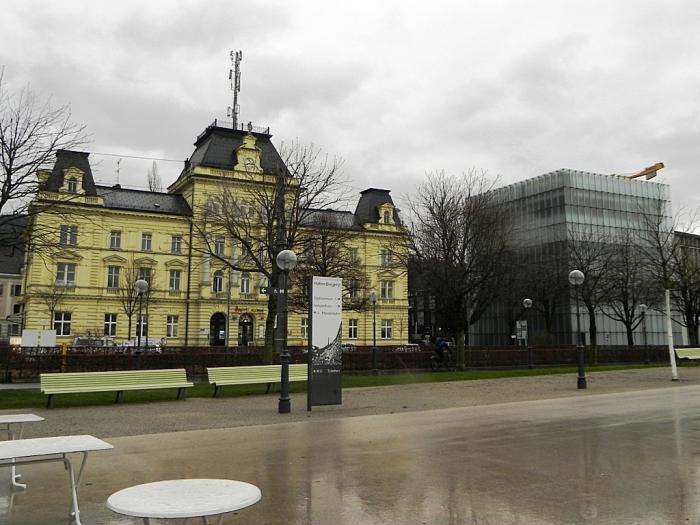 Но нас же интересует нечто необычное, креативное – современный символ города. И он в Брегенце тоже имеется – это Дом искусств. Куб, облицованный словно перламутровыми чешуйками панелями из травленного стекла, в зависимости от погоды и времени суток по разному отражает свет. В наш приезд отражать было практически нечего, поэтому Дом искусств, по-видимому, «пытался» только поглощать, чтобы не отображать окружающую серость.