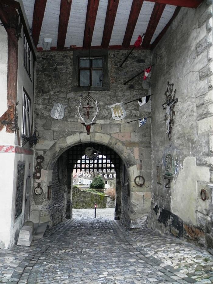 Она ведёт к Нижним воротам, украшенным графскими гербами.