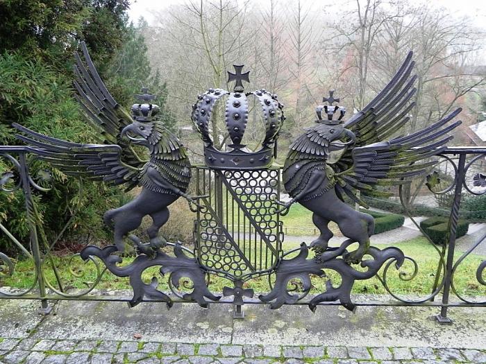 Несмотря на то, что частный характер сооружения очевиден, я почему-то решил, что замок доступен для посещения. Поэтому, зайдя внутрь, стал ломиться во все двери. Владельцы замка поступили мудро. Вместо того чтобы платить охране, они, для защиты от дураков, установили металлические решётки, перекрывающие доступ посторонних в частные покои. Именно по этой причине до меня не сразу дошло, что нас здесь не ждут. Общедоступным оказался лишь находящийся в цокольном этаже Гербовый зал, в котором размещаются временные выставки. Во время нашего посещения там была развёрнута музейная экспозиция знаменитой фабрики мягкой игрушки .