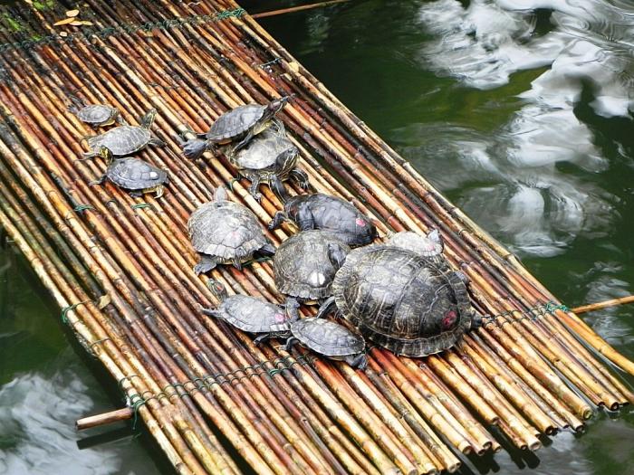Изредка мимо посетителей павильона проносятся маленькие стаи необычайно шустрых пернатых. А на бамбуковых плотах купаются в неге многочисленные черепахи. На их фоне известный кот, которому «живётся весело, вольготно на Руси», просто нервно курит в сторонке.