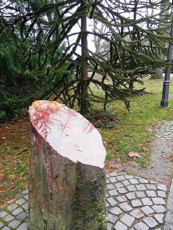 Здесь же примостился и пенёк, доставленный из лесов Аризоны, возраст которого составляет 170 миллионов лет. Немудрено, что за эти годы он превратился в благородный камень.