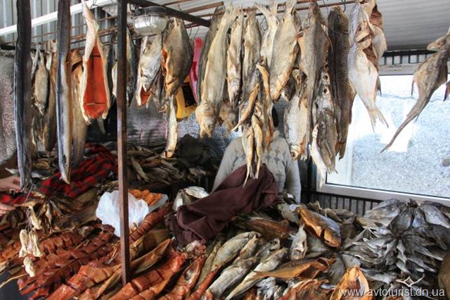 На выезде из поселка есть рыбный рынок, с довольно большим ассортиментом сушенной рыбы. Немного затарились здешними образцами, что бы было нескучно в дороге.