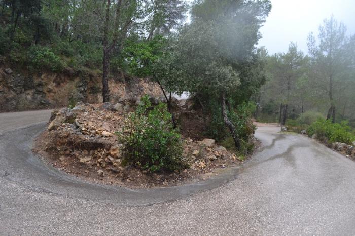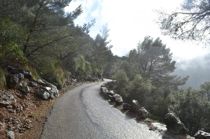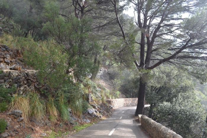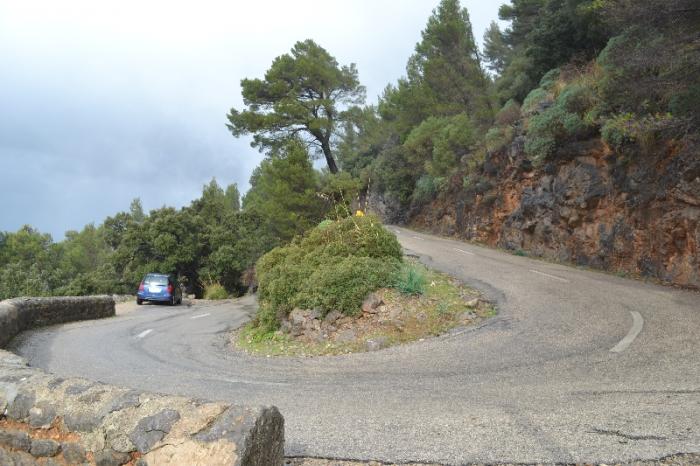 Немного на север и опять сворачиваем вниз, к порту де Вальдемосса. Дорога также нещадно петляет своими нескончаемыми поворотами. Она такая же узкая, только зачем то посередине дороги нарисована прерывистая линия, хотя ширина всей дороги редко становится более 4 метров, а на скальных участках – и того меньше.