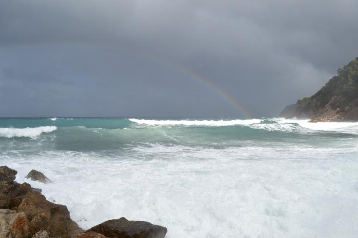 По пути останавливаемся на смотровой ресторна Эс Грау (местечко Мирадор де Риккардо Рока). Ресторан закрыт, но поднявшись над туннелем на смотровую перед нами отрылся сногшибательный вид на отвесные скалы, бухты, взбесившееся море, бьющееся громадными волнами о скалы. Ветер такой, что просто сдувает.