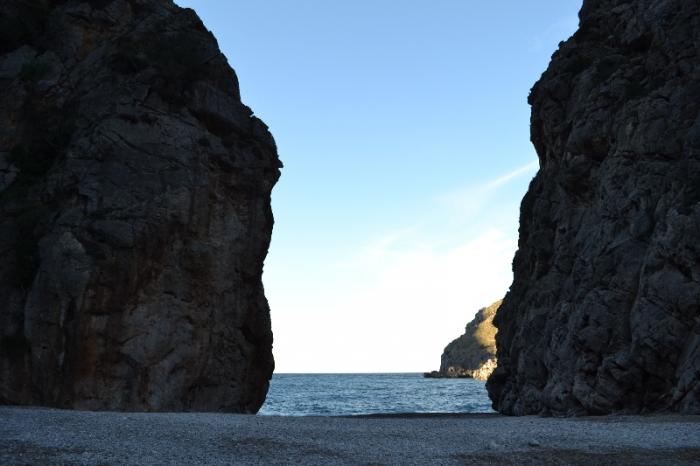 Пешеходная тропа постепенно сужается и, в конце концов, минуя пару пешеходных туннелей, вы попадаете в соседнюю долину. Она напоминает пляж, очень узкий у побережья, зажатый отвесными скалами (ширина пляжа в бухте не более 30 метров), расширяющийся вглубь ущелья и зажатый отвесными скалами со всех сторон. Очень необычно и красиво.