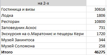Затраты на 2-х на жилье, еду, экскурсии на Закинтосе:
