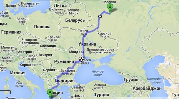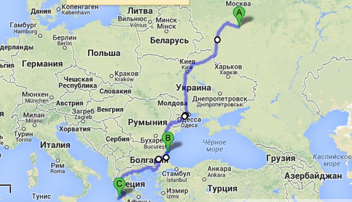 Маршрут туда: Тула-Калуга-Брянск-Киев-Одесса-Галац-Брэила-Слобозия-Варна-Несебр-Бургас-Салоники-Янина-Патры-Килини-о.Закинтос.